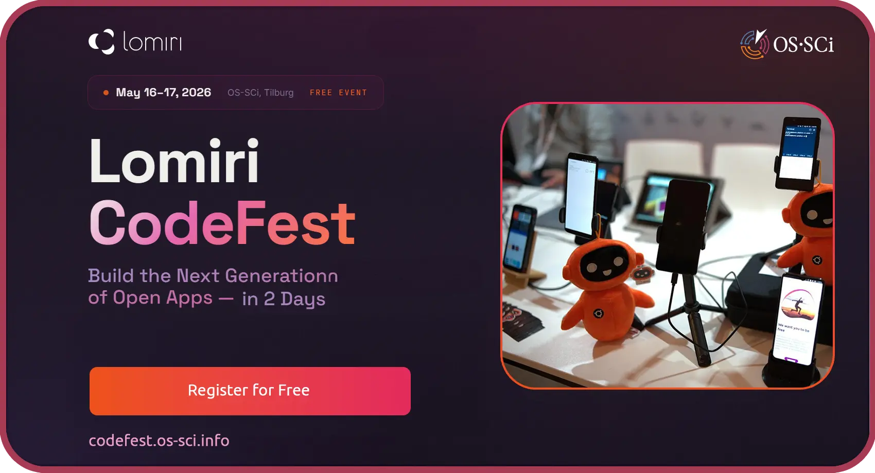 Registreer je nu gratis voor de Lomiri CodeFest van OS-SCi. Ontdek op 16 en 17 mei 2026 in Tilburg hoe jij kunt bijdragen aan de toekomst van open-source apps. Leer, bouw, ontmoet de community en zet jouw ideeën om in echte impact.