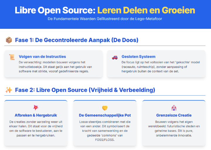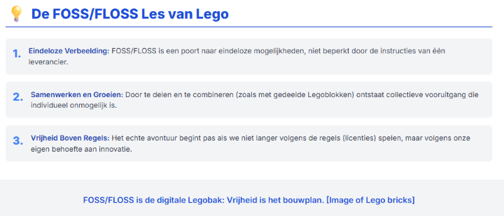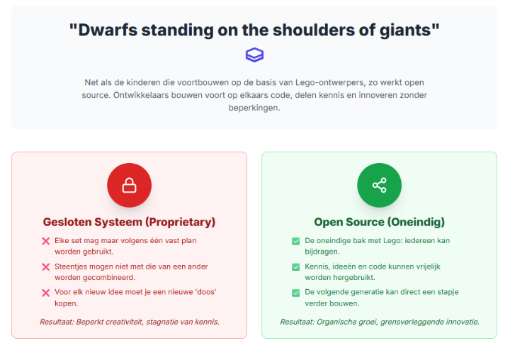 Wat we toen niet beseften, was dat we onbewust leefden volgens het principe van dwarfs standing on the shoulders of giants. Net zoals wij voortbouwden op de basis die Lego-ontwerpers ons gaven, zo werken vrije software en open source: ontwikkelaars bouwen voort op elkaars code, delen kennis en innoveren zonder beperkingen. Stel je voor dat Lego proprietary was geweest, dat elke set alleen volgens één vast plan mocht worden gebruikt, dat je steentjes niet met die van een ander mocht combineren, of dat je voor elk nieuw idee een nieuwe doos moest kopen. Dan was de magie verdwenen, net als in de proprietary softwarewereld, waar gesloten systemen creativiteit beperken. Open source is als die oneindige bak met Lego: iedereen kan bijdragen, hergebruiken en delen, zodat de volgende generatie weer een stapje verder kan bouwen. Zo groeit kennis, net als onze Lego-werelden, organisch en zonder grenzen