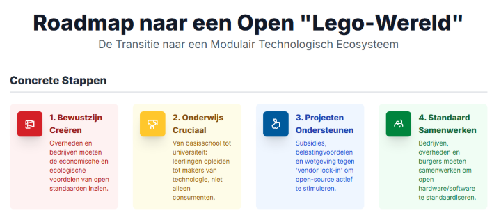 De overgang naar een open, modulair technologisch ecosysteem vraagt om concrete stappen. Eerst moeten we bewustzijn creëren: overheden, onderwijsinstellingen en bedrijven moeten leren dat open standaarden en herbruikbare bouwblokken niet alleen ethisch, maar ook economisch en ecologisch voordelig zijn. Vervolgens is onderwijs cruciaal, van basisscholen tot universiteiten, waar leerlingen niet alleen consumenten, maar makers van technologie worden. Daarnaast moeten we open-sourceprojecten actief ondersteunen, bijvoorbeeld door subsidies, belastingvoordelen voor bedrijven die bijdragen aan open ecosystemen, en wetgeving die vendor lock-in tegengaat. Ten slotte