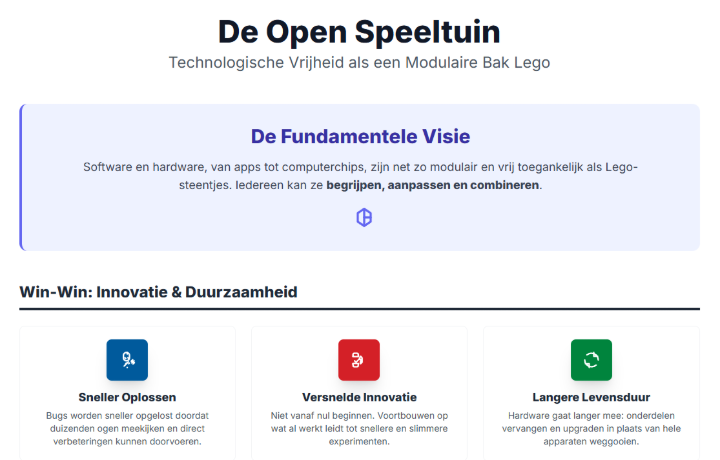 Stel je een wereld voor waar software en hardware net zo modulair en vrij toegankelijk zijn als een grote bak Lego. In deze wereld zijn besturingssystemen, apps en zelfs computerchips niet gesloten, eigendom van één bedrijf, maar open bouwblokken die iedereen kan begrijpen, aanpassen en combineren. Net zoals kinderen met Lego niet hoeven te wachten op toestemming om een kasteel om te bouwen tot een ruimtestation, zouden ontwikkelaars, makers en gebruikers vrij kunnen experimenteren met technologie. Bugs zouden sneller worden opgelost, omdat duizenden ogen meekijken en verbeteren. Innovatie zou versnellen, omdat je niet elke keer vanaf nul hoeft te beginnen, maar kunt voortbouwen op wat al werkt. Hardware zou langer meegaan, omdat je onderdelen kunt vervangen en upgraden in plaats van hele apparaten weggooien. Scholen zouden kinderen niet alleen leren *hoe* ze technologie moeten gebruiken, maar ook *hoe* het werkt en hoe ze het zelf kunnen vormgeven.