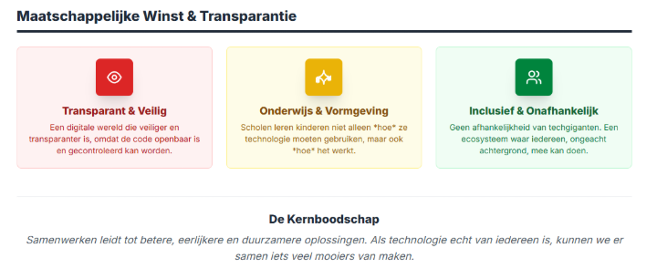 De maatschappelijke winst? Een digitale wereld die transparanter, veiligere en inclusiever is. Geen afhankelijkheid van enkele techgiganten, maar een ecosysteem waar kennis wordt gedeeld en waar iedereen, of je nu een student, een kleine ondernemer of een wetenschapper bent, mee kan doen. Net zoals Lego ons leerde dat samen bouwen leuker en slimmer is dan alleen spelen, zou open technologie ons leren dat samenwerken tot betere, eerlijkere en duurzamere oplossingen leidt. Het zou niet alleen de digitale kloof verkleinen, maar ook een cultuur van creativiteit en eigenaarschap stimuleren. Want als technologie echt van iedereen is, kunnen we er samen iets mooiers van maken.