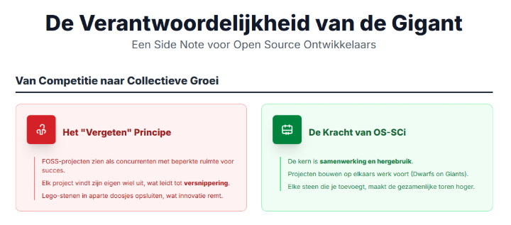 Het idee van Dwarfs standing on the shoulders of Giants is de filosofische kern van open source, maar in de praktijk vergeten veel ontwikkelaars weleens dat ze zelf ook ooit op andermans schouders zijn geklommen. Sommige FOSS-ontwikkelaars zien andere open-sourceprojecten als concurrenten, alsof er maar beperkt ruimte is voor succes, terwijl juist samenwerking en hergebruik de kracht van open source vormen. Deze mentaliteit remt innovatie: als elk project zijn eigen wiel uitvindt, versnippert de gemeenschap haar energie en mist ze de kans om echt transformatieve oplossingen te bouwen. Het is als Lego-stenen in aparte doosjes opsluiten: je beperkt niet alleen jezelf, maar ook anderen die op jouw werk hadden kunnen voortbouwen. Wanneer je project groeit en zelf een Giant wordt, komt