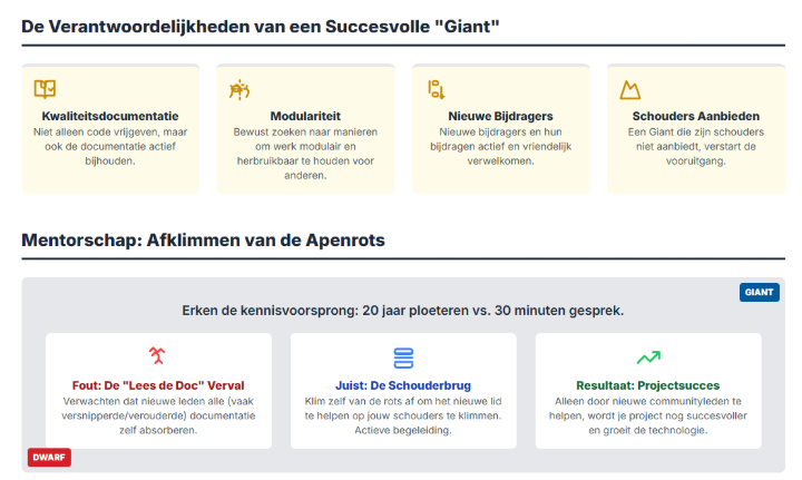 daar een verantwoordelijkheid bij kijken: actief bijdragen aan de gemeenschap die jou mogelijk maakte. Dat betekent niet alleen code vrijgeven, maar ook documentatie verbeteren, nieuwe bijdragers welkom heten, en bewust zoeken naar manieren om je eigen werk modulair en herbruikbaar te houden. Een Giant die zijn schouders niet aanbiedt, verstart de vooruitgang; een Giant die dat wel doet, maakt de hele gemeenschap sterker. Open source draait niet om competitie, maar om collectieve groei, want elke steen die je toevoegt, maakt de toren waar iedereen in kan klimmen net een stukje hoger.