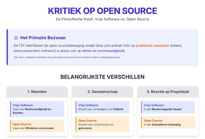 De FSF kritiseert de open-sourcebeweging omdat deze zich richt op praktische voordelen in plaats van ethiek. Hoewel open-source-voorstanders beweren dat open ontwikkeling leidt tot betere en betrouwbaardere software, waarschuwt de FSF dat deze benadering het risico loopt de diepere kwesties van gebruikersautonomie en rechtvaardigheid naar de achtergrond te schuiven. De filosofie van open source, met haar puur praktische waarden, belemmert volgens de FSF het begrip van de diepere ideeën achter vrije software (gnu.org).