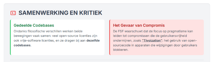(OSI) focust op praktische voordelen zoals innovatie en efficiëntie. Beide werken vaak samen, maar de FSF waarschuwt dat open source zonder ethische focus het risico loopt