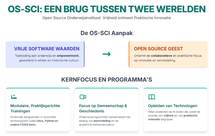 OS-SCI, een open-source onderwijsinstituut, belichaamt de waarden van beide bewegingen. Het gebruikt vrije en open-source software om modulaire, praktijkgerichte trainingen aan te bieden in Linux, Python en andere technologieën. De aanpak van OS-SCI weerspiegelt de toewijding van de vrije-softwarebeweging aan onderwijs en empowerment, terwijl het ook de collaboratieve en praktische geest van de open-sourcegemeenschap omarmt. De blog en onderwijsprogramma’s van OS-SCI benadrukken het belang van gemeenschap, kennisdeling en de historische wortels van vrije software in de academische en hackercultuur (os-sci.com).