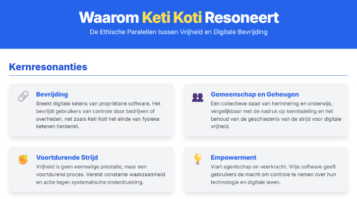 • Bevrijding: Net zoals Keti Koti het einde van fysieke ketens herdent, streeft vrije software