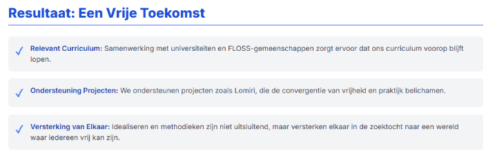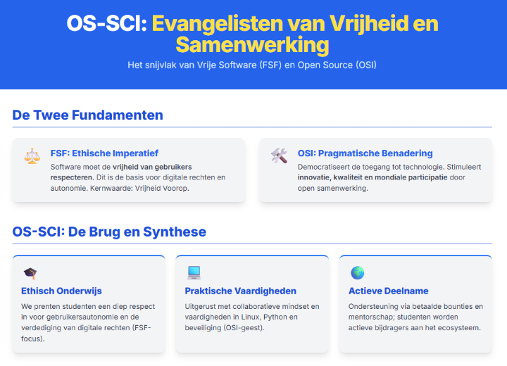 omarmen we de sterke punten en waarden van beide. Onze missie is om de techleiders van morgen te vormen met open-sourceonderwijs, mondiale samenwerking en een onwrikbaar geloof in "Vrijheid Voorop". We erkennen dat zowel de Free Software Foundation (FSF) als de Open Source Initiative (OSI) een cruciale rol hebben gespeeld in de evolutie van de digitale wereld. De ethische imperatief van de FSF, geworteld in het geloof dat software de vrijheid van gebruikers moet respecteren, is fundamenteel geweest in het definiëren van wat het betekent om echt vrij te zijn in een digitaal tijdperk. Ondertussen heeft de pragmatische benadering van de OSI de toegang tot technologie gedemocratiseerd, en bewezen dat open samenwerking innovatie, kwaliteit en mondiale participatie kan stimuleren.