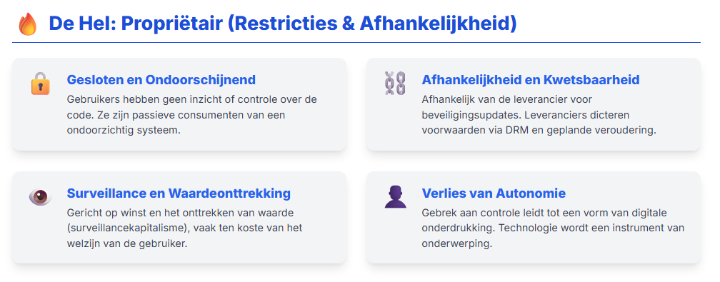 Gebruikers zitten vast in starre, ondoorzichtige systemen waar ze geen inzicht in of controle over hebben over de code die hun apparaten en data bestuurt. Leveranciers dicteren de voorwaarden via restrictieve licenties, geplande veroudering en surveillancekapitalisme, waarbij winst vaak boven het welzijn van gebruikers wordt gesteld. Dit model kweekt kwetsbaarheid: gebruikers zijn afhankelijk van bedrijven voor beveiligingsupdates, privacybescherming en zelfs basisfunctionaliteit. Gesloten systemen, vendor lock-in en draconische digitale rechtenbeheer (DRM) veranderen technologie in een instrument van onderdrukking, waarbij gebruikers hun autonomie verliezen en gedwongen worden tot een cyclus van gehoorzaamheid. Waar FOSS/FLOSS bevrijdt, onderdrukt propriëtaire software, en transformeert gebruikers in passieve onderdanen van een systeem dat gericht is op het onttrekken van waarde in plaats van op empowerment. In dit paradigma is het ontbreken van vrijheid niet alleen ongemakkelijk, het is een vorm van digitale onderdrukking, waarbij het gebrek aan controle over eigen tools parallel loopt aan het verlies van autonomie in een steeds verder gedigitaliseerde wereld.