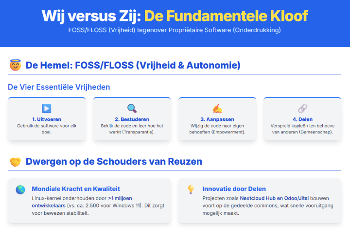 vertegenwoordigt meer dan alleen een verschil in licenties; het belichaamt een fundamentele botsing van waarden, controle en gebruikersempowerment. FOSS/FLOSS, geworteld in de ethische imperatieven van de vrije-softwarebeweging of de pragmatische samenwerking van open source, geeft gebruikers de vier essentiële vrijheden: om software uit te voeren, te bestuderen, aan te passen en te delen. Deze transparantie en autonomie bevorderen innovatie, gemeenschapsgedreven verbeteringen en een cultuur van delen, waarbij technologie dient als een instrument voor collectieve vooruitgang in plaats van bedrijfscontrole. In deze "hemel" zijn gebruikers geen passieve consumenten, maar actieve deelnemers die software kunnen aanpassen aan hun behoeften, bugs kunnen fixen en bijdragen aan een globale commons. FOSS/FLOSS gedijt op vertrouwen, samenwerking en het geloof dat kennis voor iedereen toegankelijk moet zijn, wat leidt tot een ecosysteem waar creativiteit en probleemoplossing gedijen zonder kunstmatige barrières.