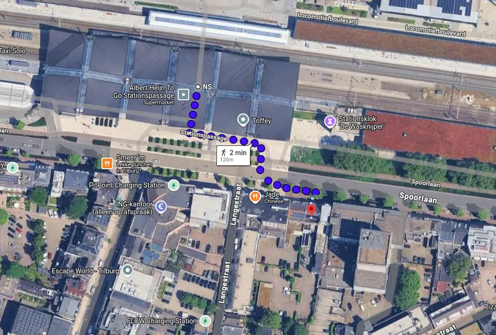 OS-SCi is situated directly across Tilburg Central Station — just a 2-minute walk (120m). Exit the station via the Stationspassage and cross the Spoorlaan.